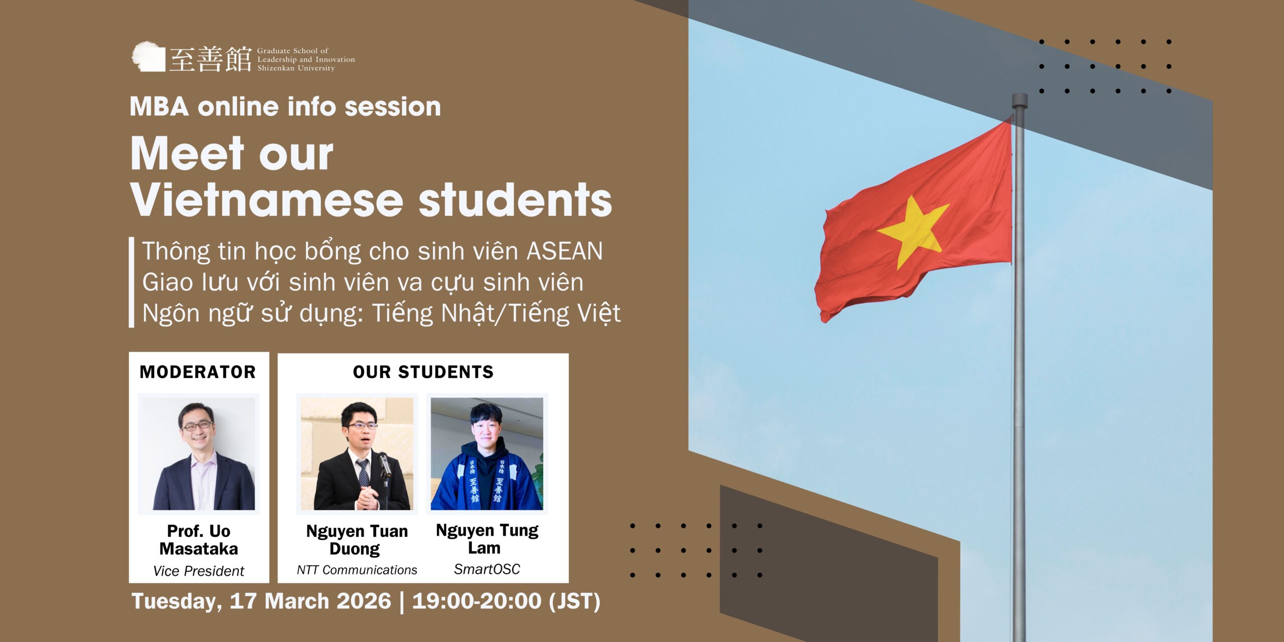 2026-3-17 7:00 PM 2026-3-17 8:00 PM Asia/Tokyo 至善館MBA特別説明会:Meet Our Vietnamese Students Online (Zoom)