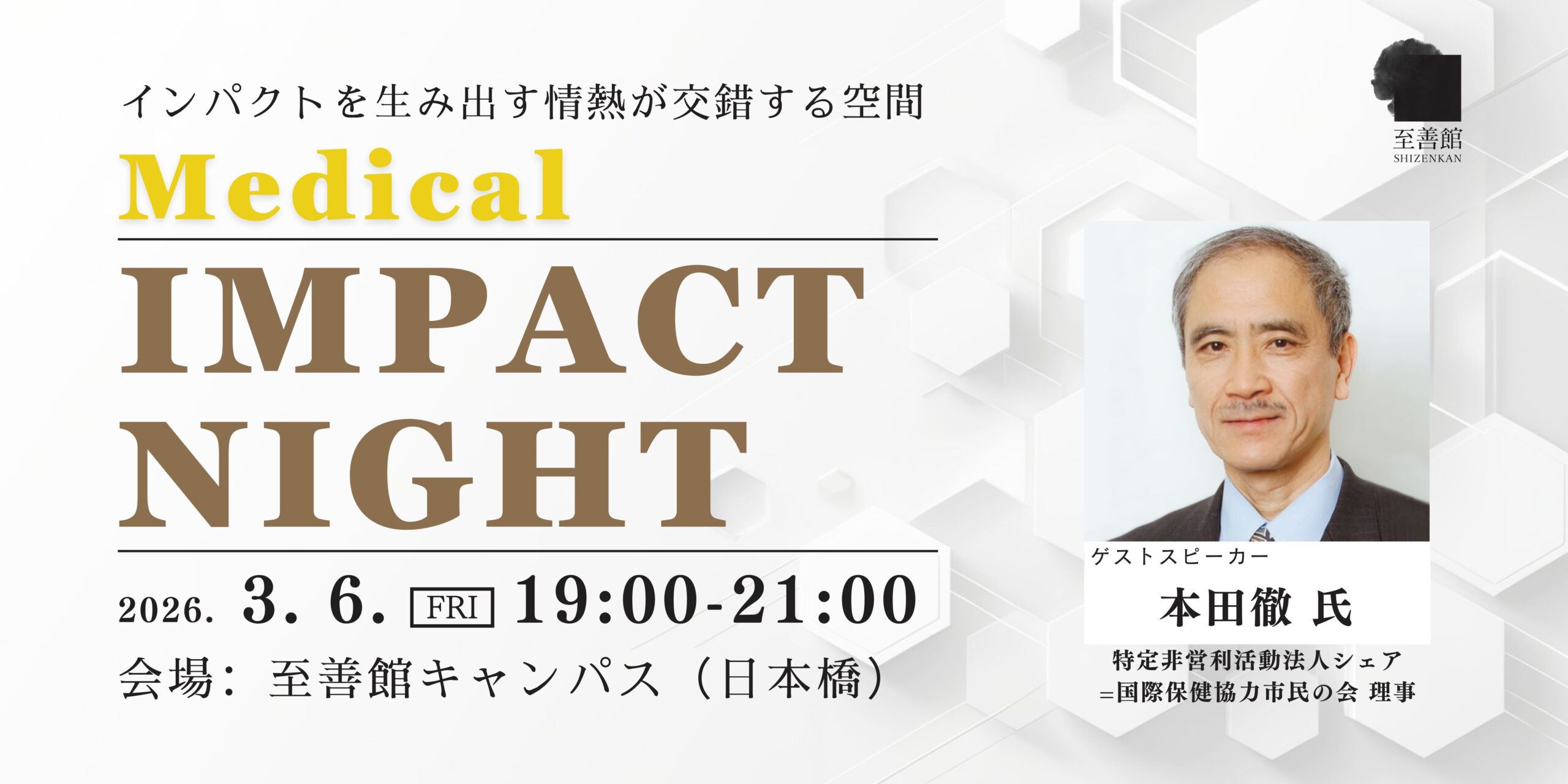 ”Medical Impact Night”は、Impact Nightの系譜を受け継ぎ開催されるものです。社会が抱える医療の課題に直接アプローチし、インパクトを生み出したいと真剣に考える人たちの集いとするため、”Medical Impact Night”は、一般公開イベントとして開催いたします。医療・介護・福祉の分野で新しい挑戦を続ける実践者をお迎えし、参加者の皆さんと共に知見を交わし合うことで、次の一歩を考える時間にしたいと考えています。